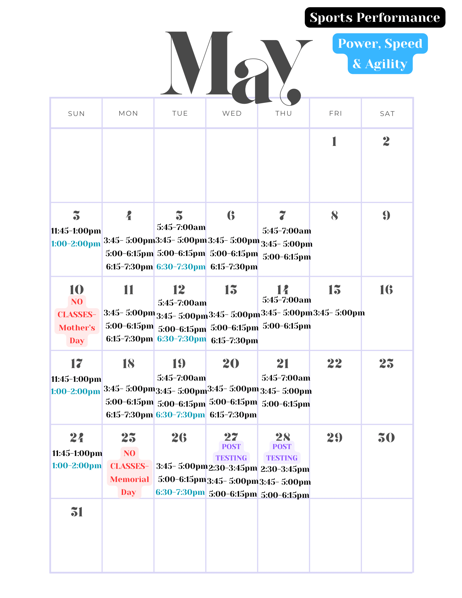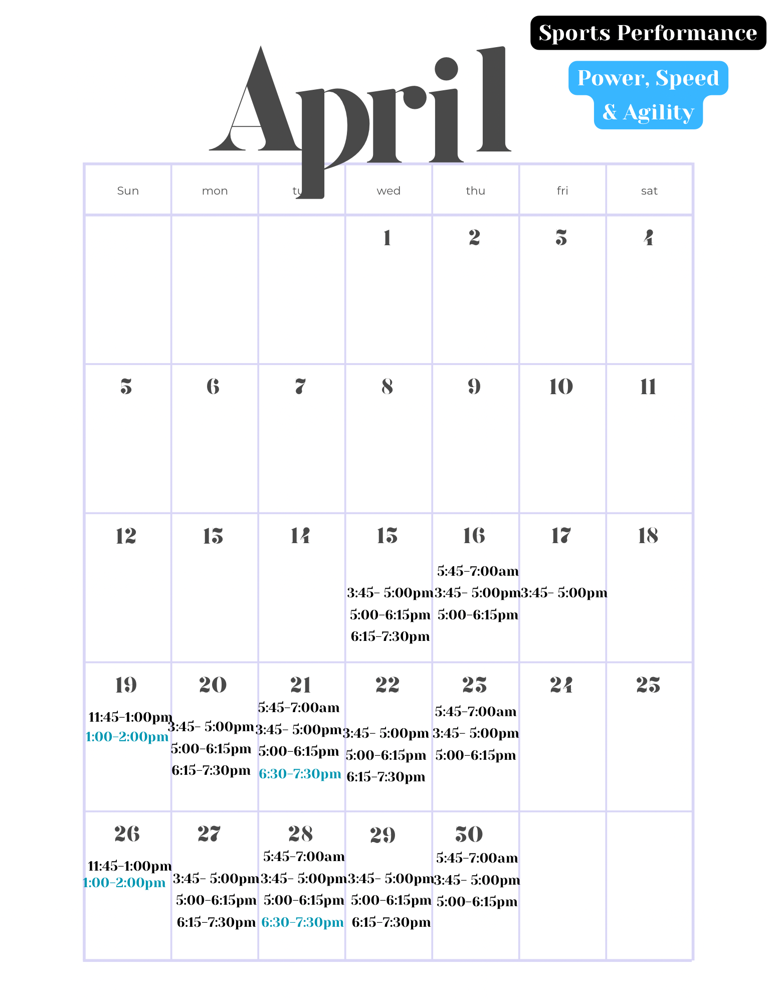 The Power, Speed & Agility classes are designed for athletes looking to enhance overall power, speed, and agility. It is intended as a supplement to our Sports Performance program.