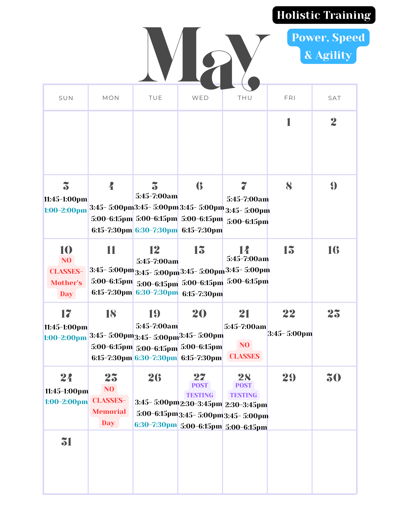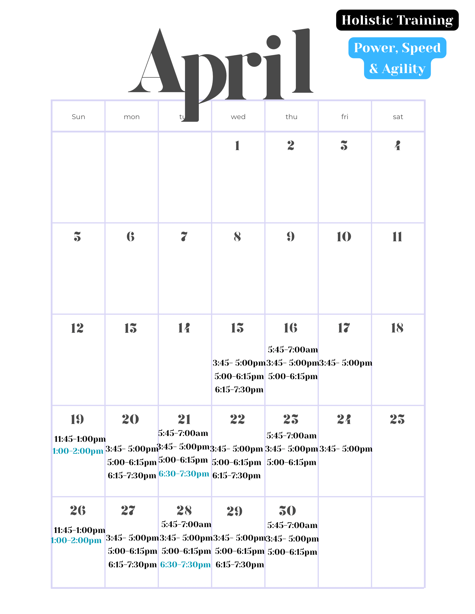 The Power, Speed & Agility classes are designed for athletes looking to enhance overall power, speed, and agility. It is intended as a supplement to our Holistic Training classes.